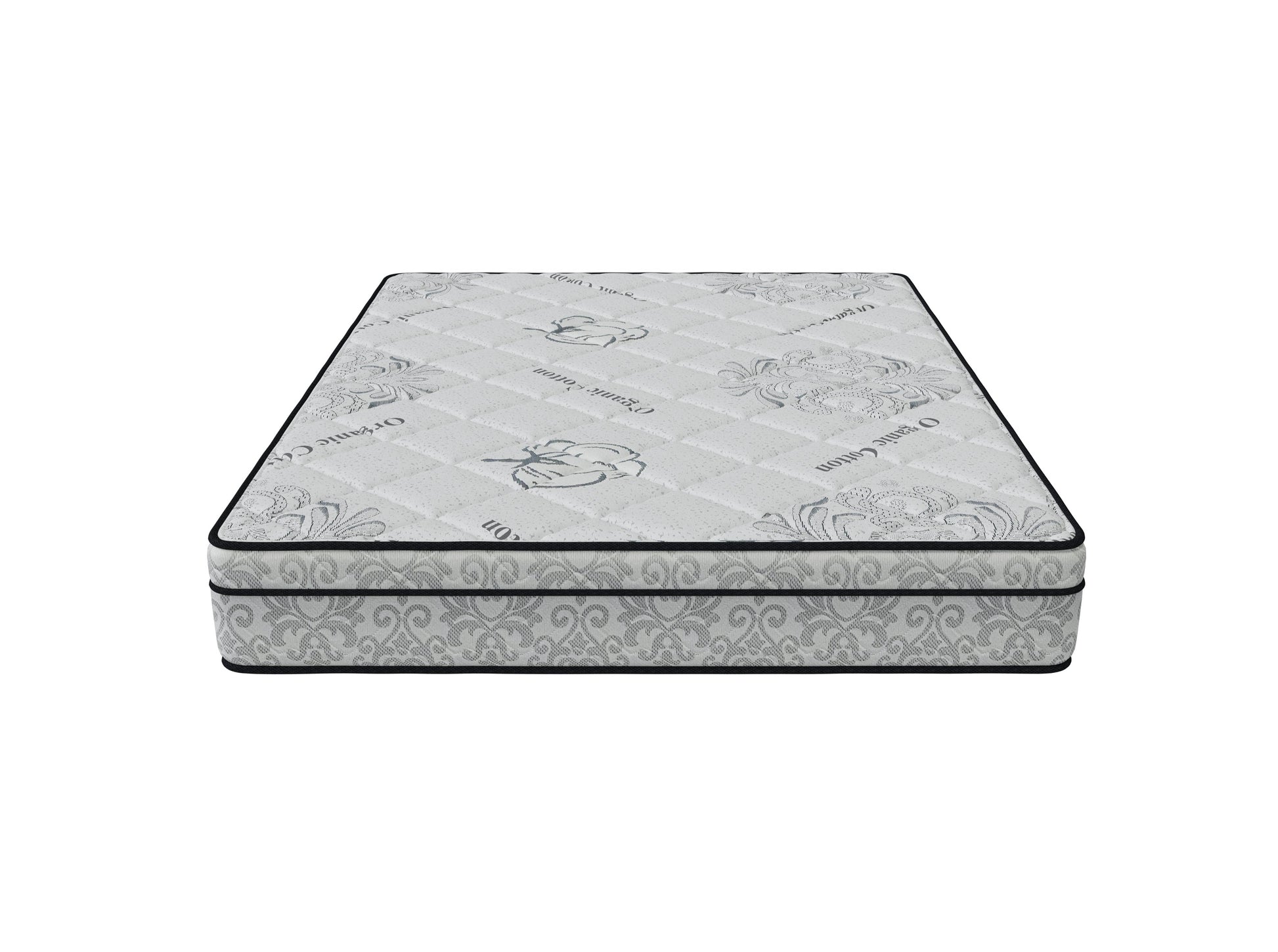 Experience comfort and support with our 9-inch Orthopaedic Euro Top Mattress. It features a sturdy 416 coil, 13 gauge spring system with double tempered coils and edge guard for lasting support. Wrapped in organic cotton fabric with black edge tape, it combines ½ inch medium firm foam and 20 Oz Hallow Fibre for comfort. The Euro Top includes 1½ inch high-density foam over a ¾ inch foam support base, enhanced with a heavy-duty fibre pad for lumbar support and a ¼ inch quilted border for elegance and extra comfort.
